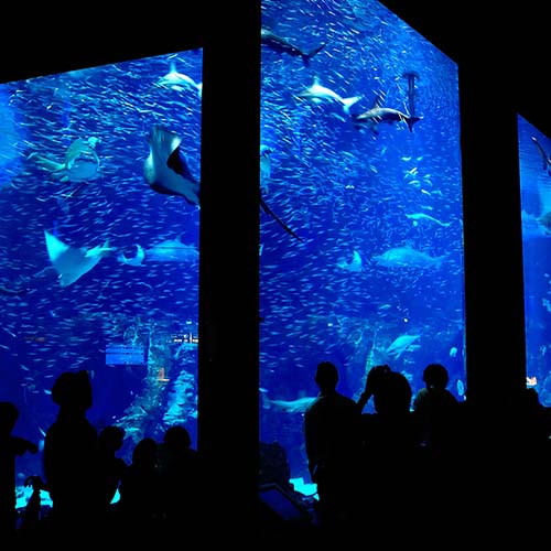 用意されたVR HMD(ヘッドマウントディスプレイ)をかぶると、まるで巨大水槽のど真ん中にいるかのような状況が再現されます。モーションキャプチャーによってお客様の動きを読み取り、巨大水槽の中を自由に動き回ることが可能です。また時間帯によっては魚たちに餌付け体験が出来たり、お客様同士でゲームを楽しむことも出来ます。
